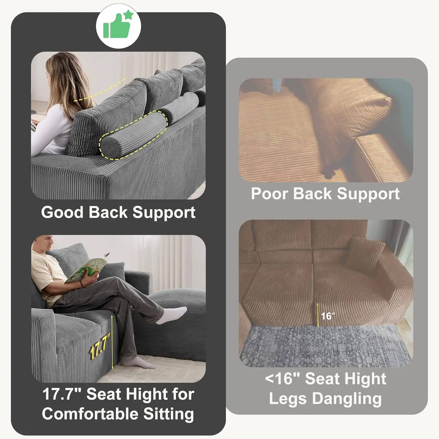 Our cloud sofa rises to 17.7 inches (most sofas are around 16 inches) for optimal leg comfort. The backrest is also added with a cylindrical cushion for enhanced support, ensuring relaxation whether you're reading or watching TV.