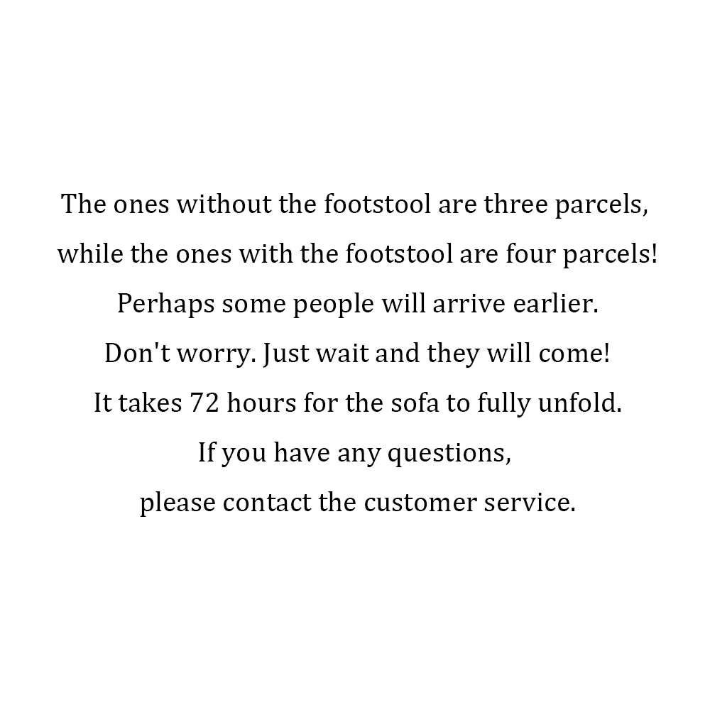 Note that this item ships in multiple parcels (3–4 boxes) and may arrive on different days. To ensure a smooth delivery, monitor tracking updates and be patient as each package arrives. For everyday care, vacuum regularly to remove dust and spills promptly with a damp cloth for spot cleaning on the fabric; avoid harsh cleaners and direct sunlight to maintain color and texture over time. This sofa is designed for durability in busy living spaces while preserving a refined, contemporary look.