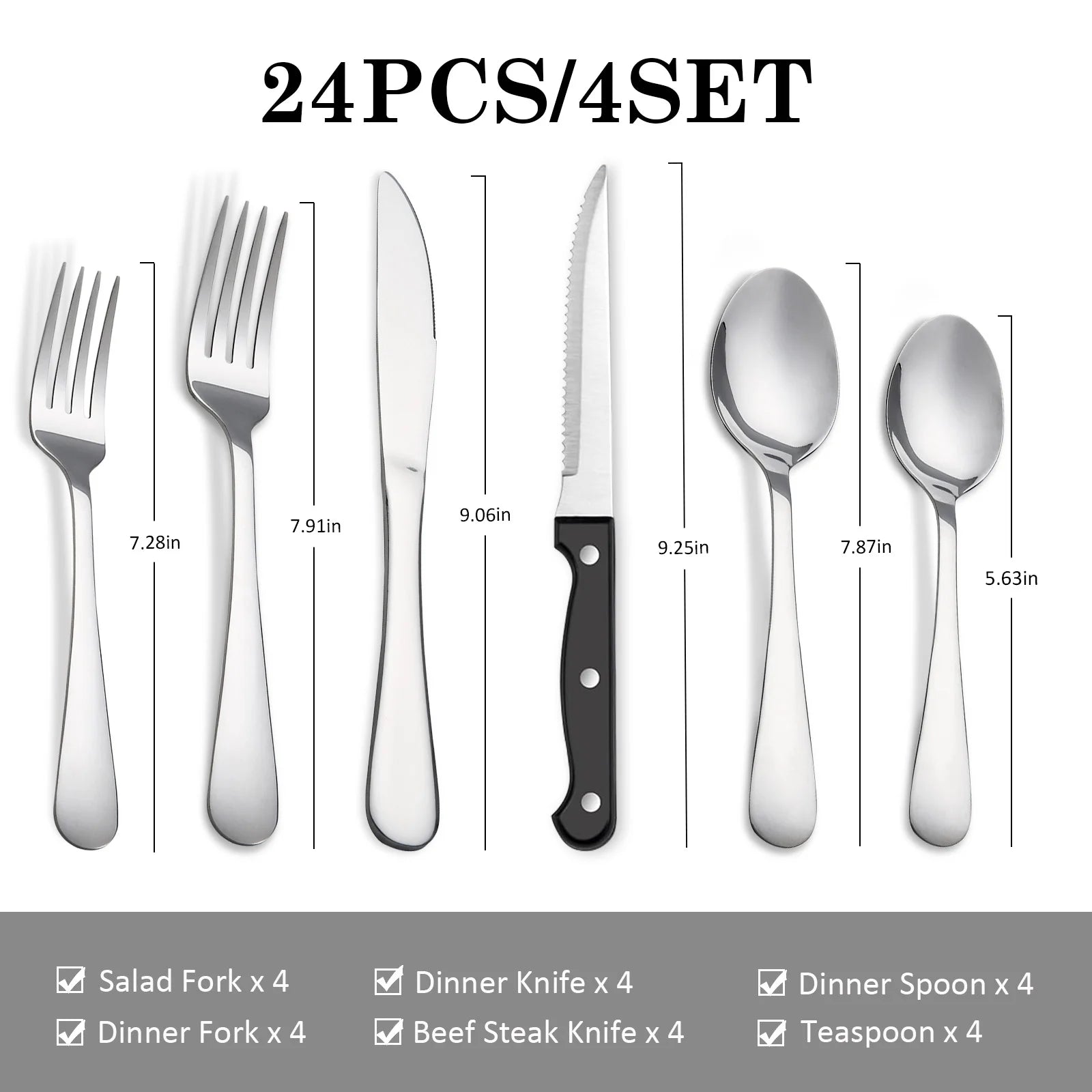 24 Piece Stainless Flatware Set For 4 With Steak Knives Forks Spoons